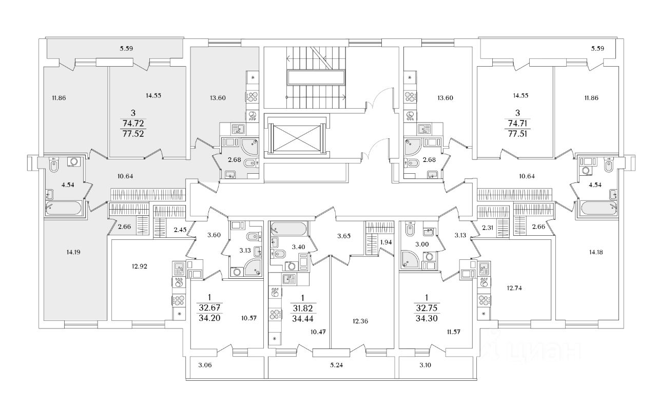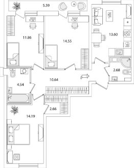 Квартира находится в 9 этажном доме, в Очередь 1, Корпус 1 на 8 этаже. Общая площадь квартиры 77,26 кв.м.