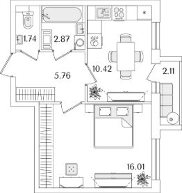 Квартира находится в 9 этажном доме, в Очередь 1, Корпус 2 на 4 этаже. Общая площадь квартиры 37,86 кв.м.