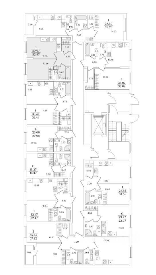 Квартира находится в 9 этажном доме, в Очередь 1, Корпус 2 на 2 этаже. Общая площадь квартиры 32,97 кв.м.