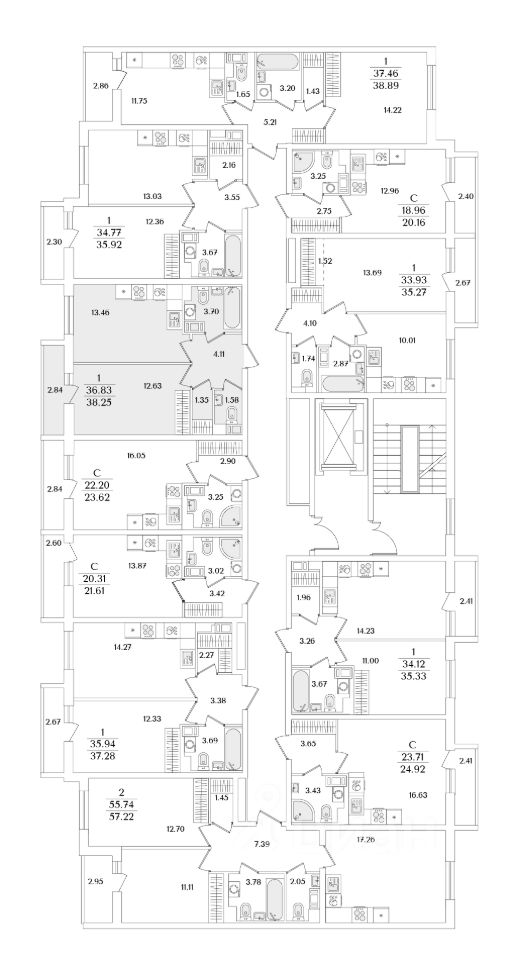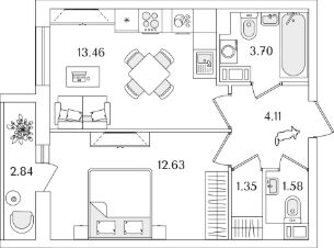 Квартира находится в 9 этажном доме, в Очередь 1, Корпус 2 на 4 этаже. Общая площадь квартиры 38,25 кв.м.