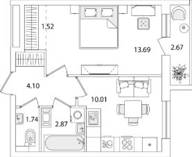 Квартира находится в 9 этажном доме, в Очередь 1, Корпус 2 на 5 этаже. Общая площадь квартиры 35,27 кв.м.