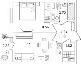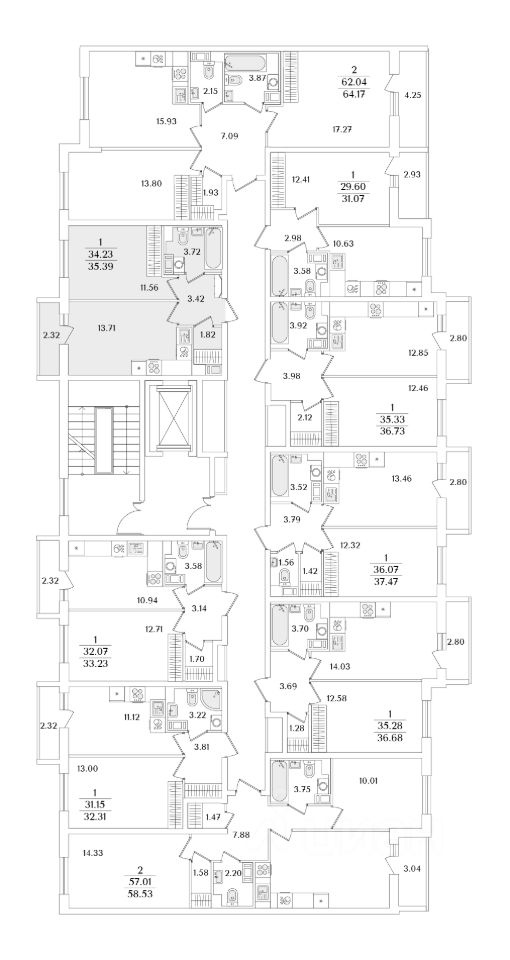 Квартира находится в 9 этажном доме, в Очередь 1, Корпус 2 на 7 этаже. Общая площадь квартиры 35,39 кв.м.