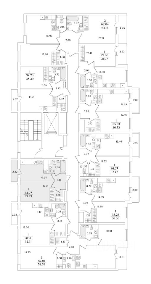 Квартира находится в 9 этажном доме, в Очередь 1, Корпус 2 на 7 этаже. Общая площадь квартиры 33,23 кв.м.