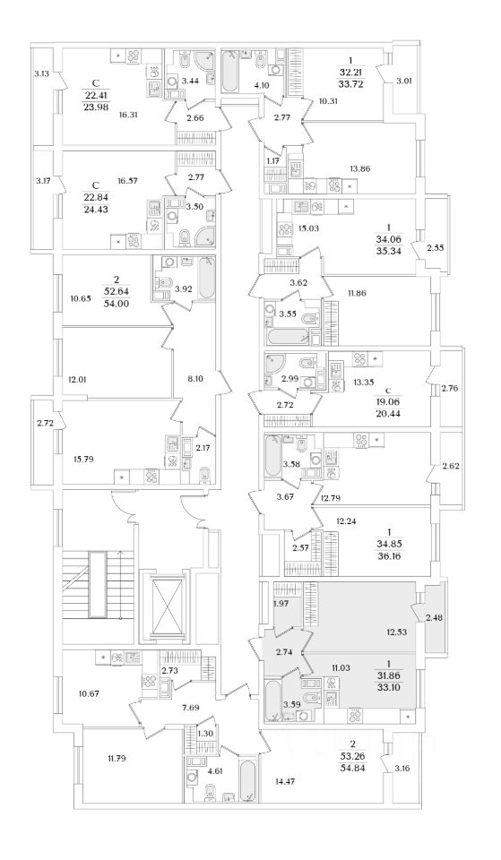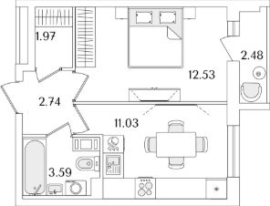 Квартира находится в 9 этажном доме, в Очередь 1, Корпус 2 на 7 этаже. Общая площадь квартиры 33,10 кв.м.