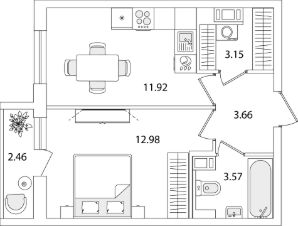 Квартира находится в 9 этажном доме, в Очередь 1, Корпус 2 на 8 этаже. Общая площадь квартиры 36,51 кв.м.
