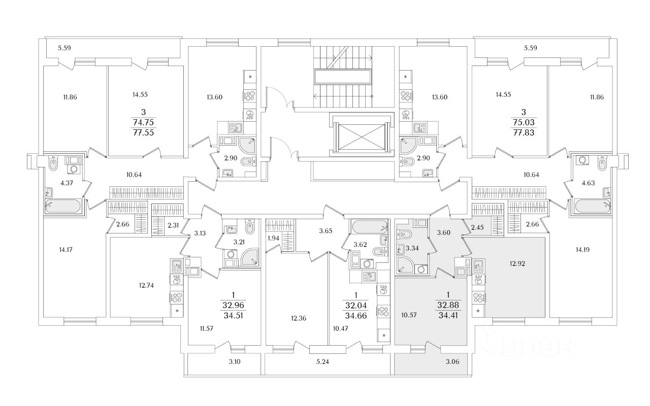 Квартира находится в 9 этажном доме, в Очередь 1, Корпус 2 на 5 этаже. Общая площадь квартиры 34,41 кв.м.