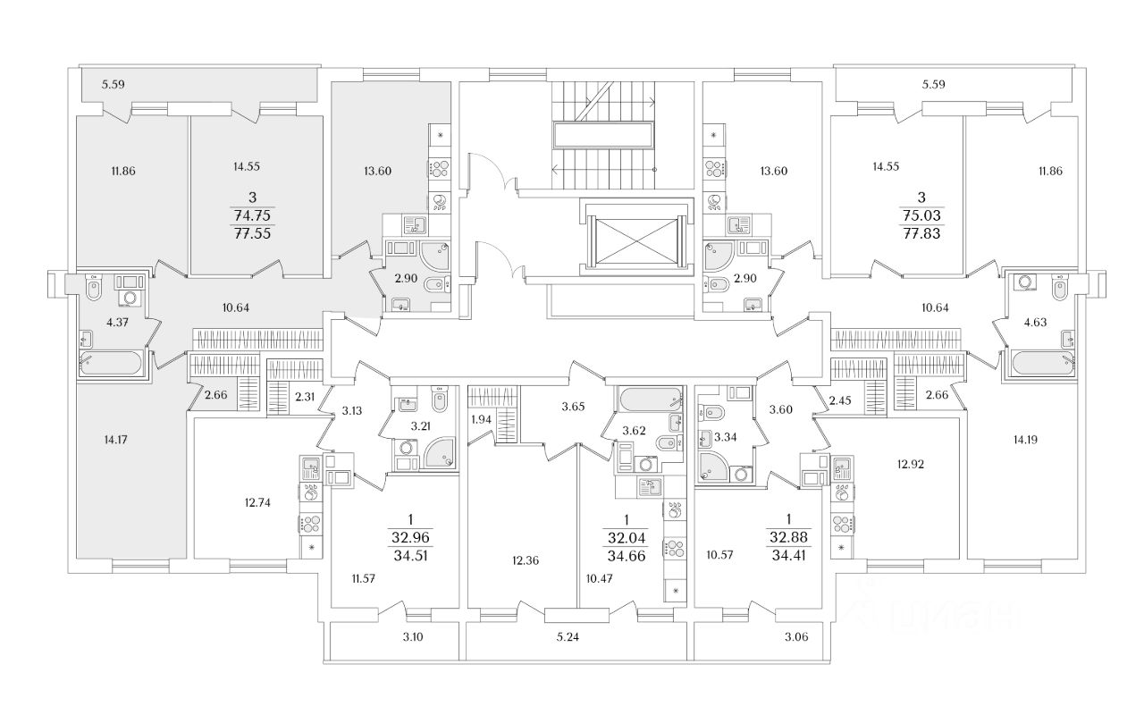Квартира находится в 9 этажном доме, в Очередь 1, Корпус 2 на 5 этаже. Общая площадь квартиры 77,55 кв.м.