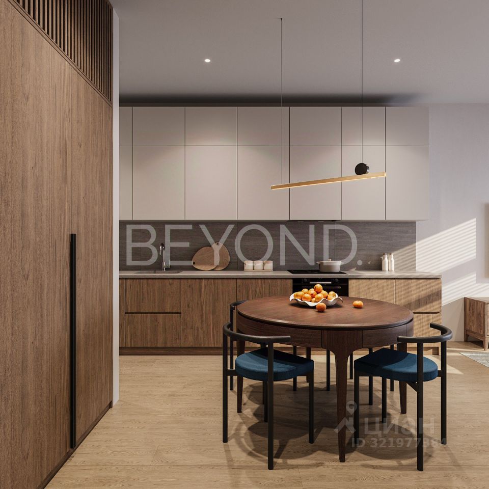 Планировка квартиры включает: светлую кухню-гостиную с зоной отдыха и обеденной группой, мастер-спальню с ванной комнатой и зонами для хранения, детскую комнату (кабинет) и гостевой санузел.