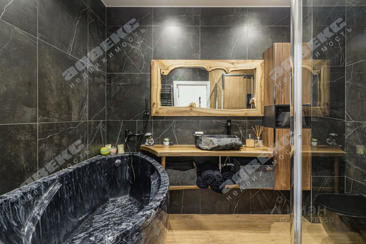 Керамогранит в санузле на стенах и на полу. Раковина из натурального камня. Ванна из литьевого мрамора.