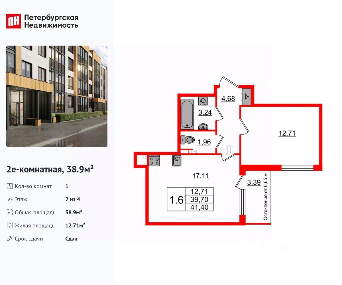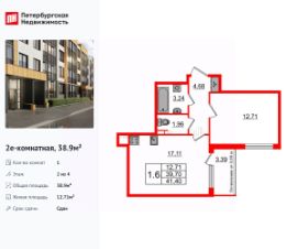 Удобная, классическая, функциональная европланировка, большая кухня-гостиная 17.11 м², просторная прихожая 4.68 м². Общая площадь квартиры - 38.9 м², жилая 12.71 м², высота потолка 2.77 м.