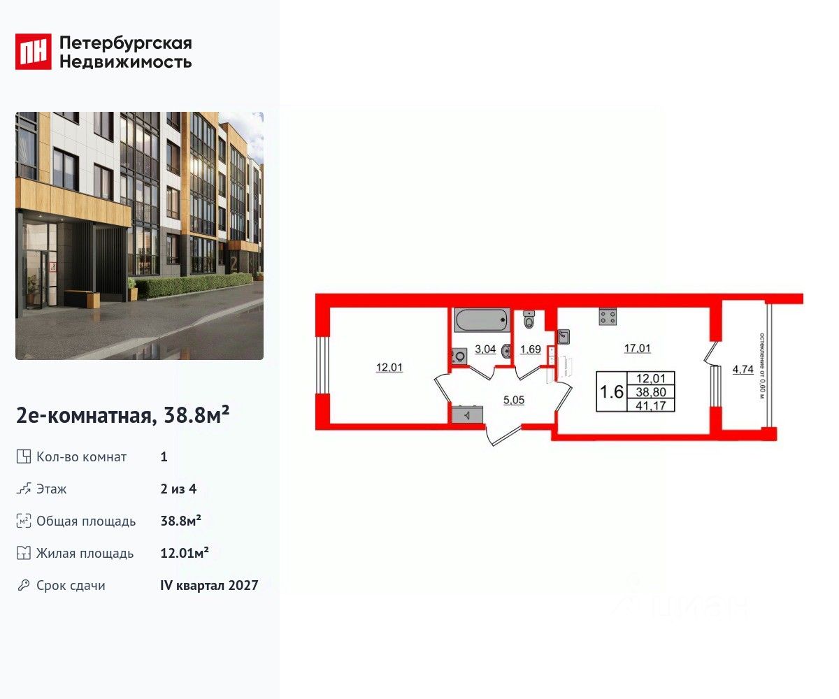 Удобная, классическая, функциональная европланировка, большая кухня-гостиная 17.01 м², просторная прихожая 5.05 м². Общая площадь квартиры - 38.8 м², жилая 12.01 м², высота потолка 2.77 м.