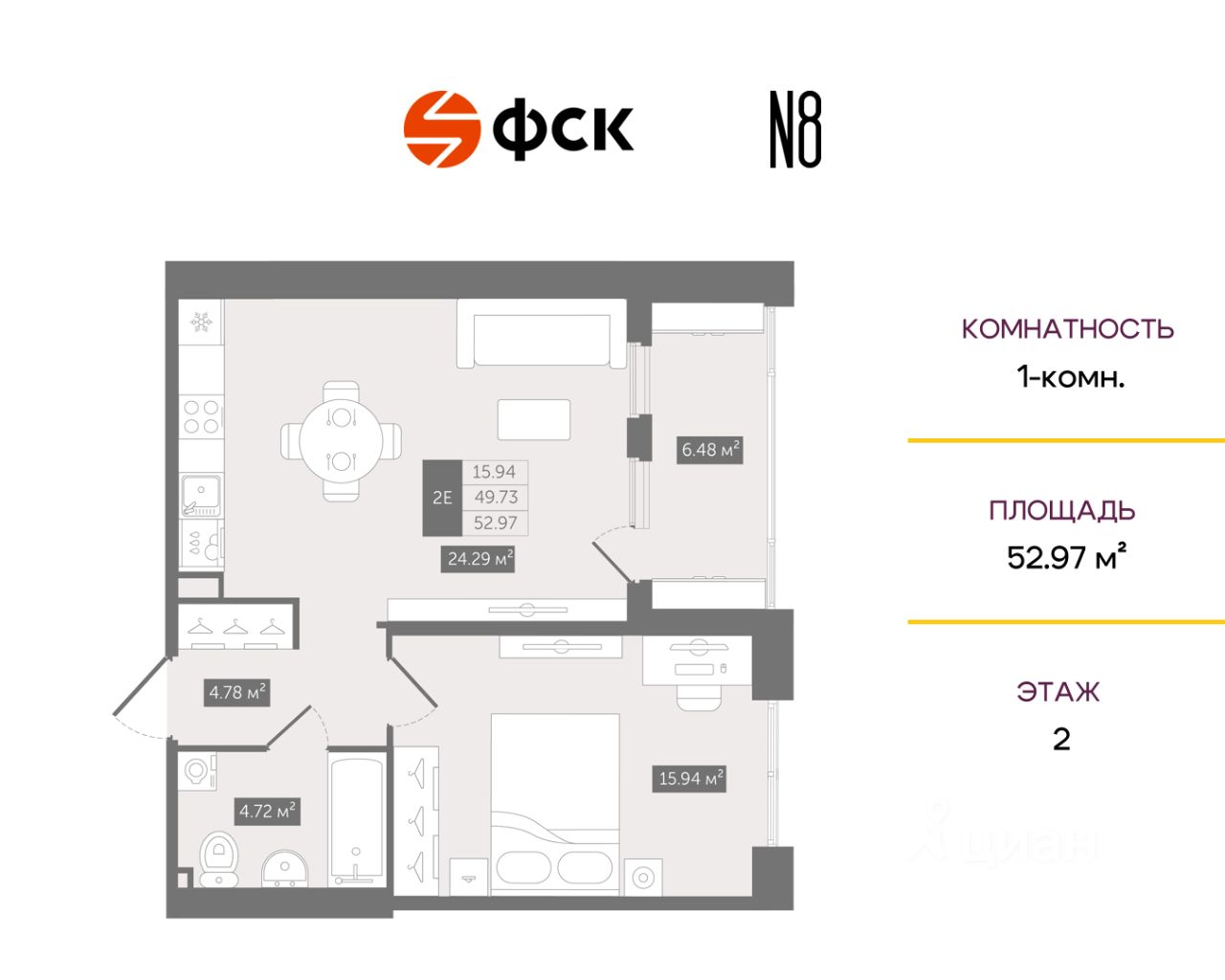 Прямая продажа от застройщика — только в этом месяце. 1-к квартира в клубном доме N8 на 2-м этаже. Общая площадь 52,97. Без отделки.