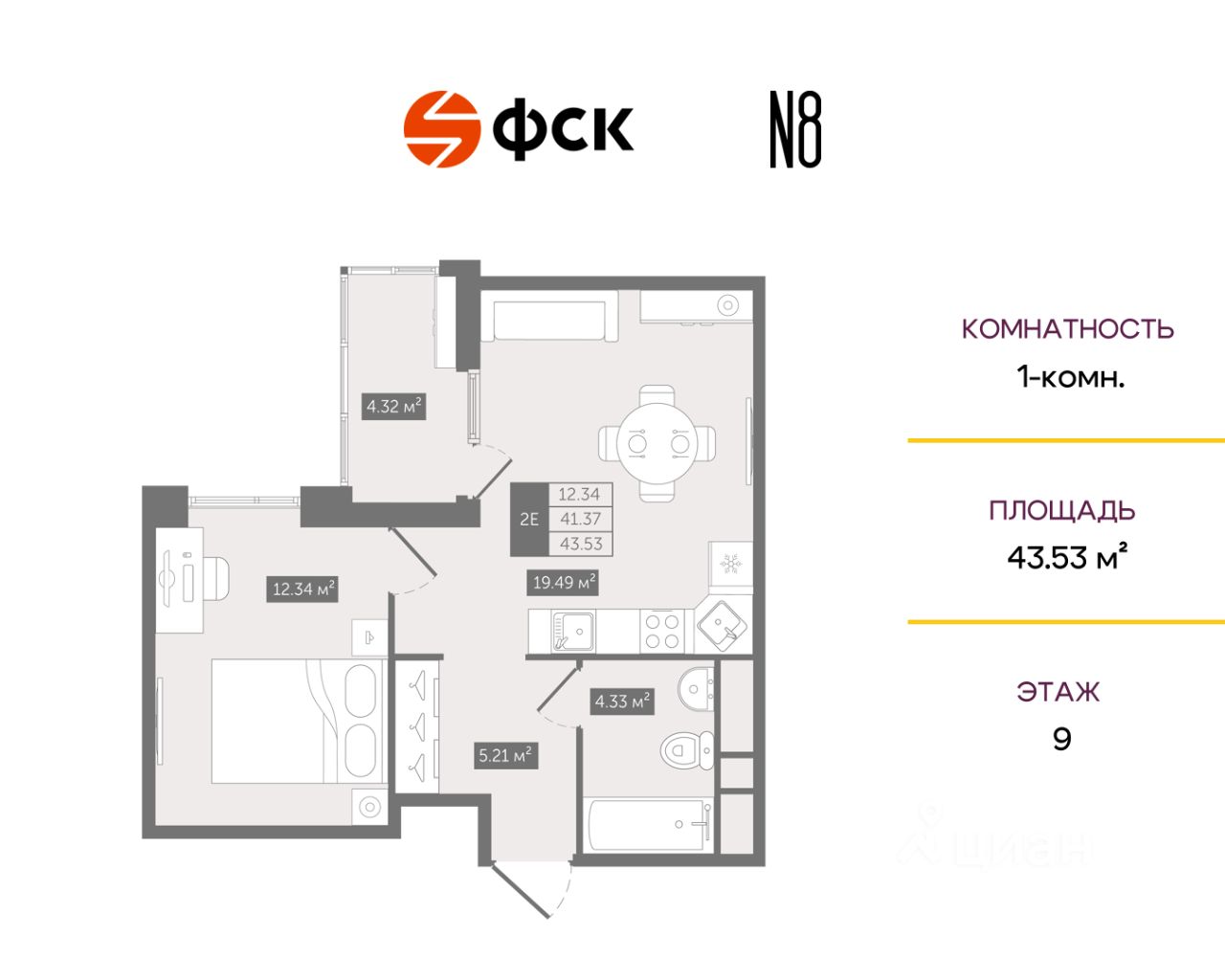 Прямая продажа от застройщика — только в этом месяце. 1-к квартира в клубном доме N8 на 9-м этаже. Общая площадь 43,53. Без отделки.