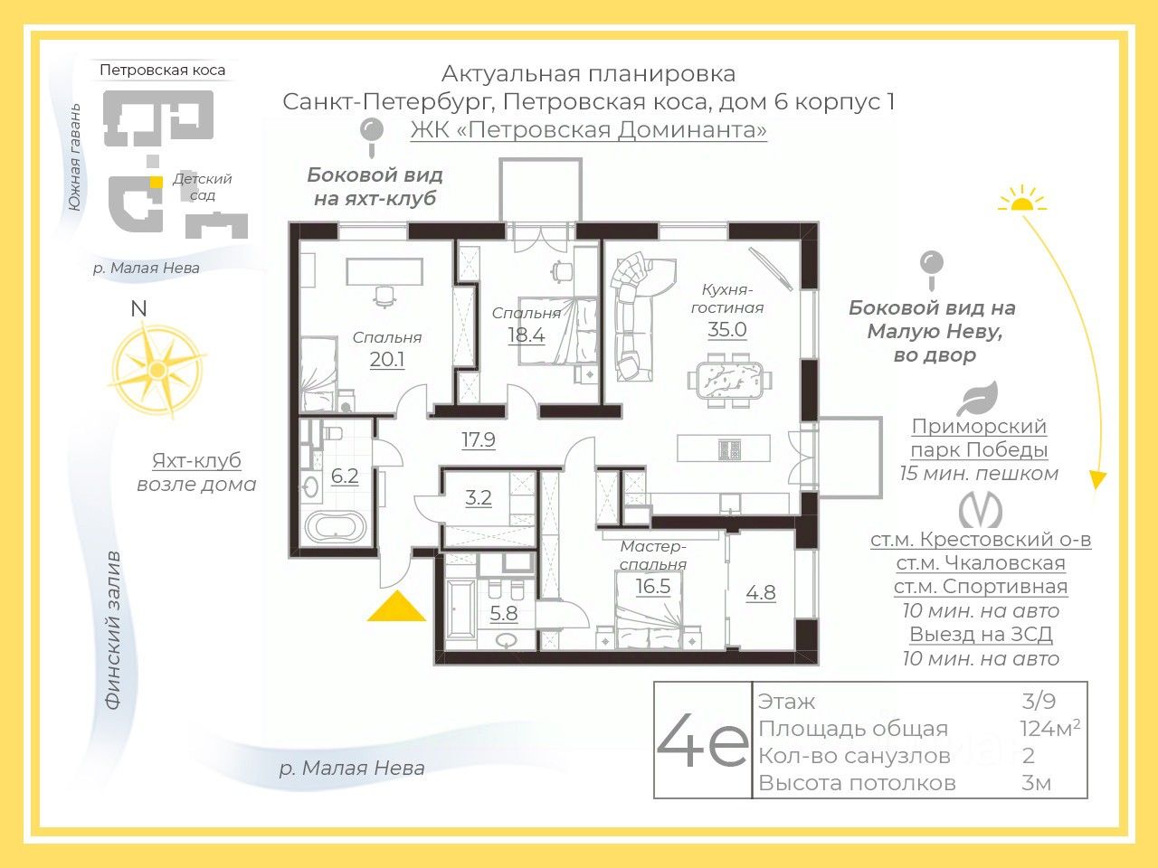 * Инфраструктура: Подземный паркинг, престижный Петроградский район. Рядом яхт-клуб, прогулочная набережная в 1 минуте от парадной. Детский сад на территории комплекса. В округе множество модных ресторанов, Парки Крестовского и Елагина островов, 10 минут на транспорте до 3 станций метро, 10 минут выезд на ЗСД.