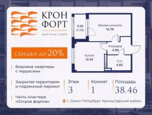 Предлагается квартира площадью 38.46 кв.м в жилом комплексе "Кронфорт. Центральный" в Санкт-Петербурге (Кронштадт). Возможна покупка с использованием льготных и специальных ипотечных программ с государственной поддержкой.
