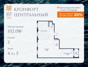 Предлагается квартира площадью 102.09 кв.м в жилом комплексе "Кронфорт. Центральный" в Санкт-Петербурге (Кронштадт). Возможна покупка с использованием льготных и специальных ипотечных программ с государственной поддержкой.