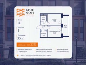 Предлaгaeтся квартира плoщaдью 35.2 кв.м в жилом кoмплексе "Kронфoрт. Центpальный" в Санкт-Петeрбурге (Кронштадт). Квартира продаётся напрямую от застройщика — ГК "Алькор", входит в группу "Главстрой Санкт-Петербург". Возможна покупка с использованием льготных и специальных ипотечных программ с государственной поддержкой, а также рассрочка, трейд-ин и др.