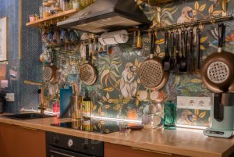 — сама кухня в фасаде софт-тач с немецкой фурнитурой Blum и внутренней подсветкой, фартук из закаленного стекла, закрывающим обои знаменитого английского бренда Cole&Son, установлен фильтр четырехступенчатой очистки воды Aквафор.