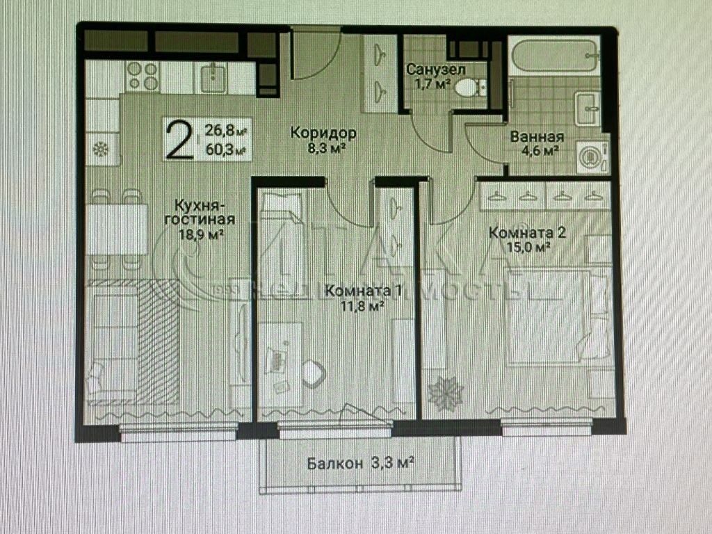 Общая площадь 60,3 кв.м, вместительный коридор 8,3 кв.м., раздельный санузел 1,7 кв.м., ванная 4,6 кв.м., кухня-гостиная 18,9кв.м.