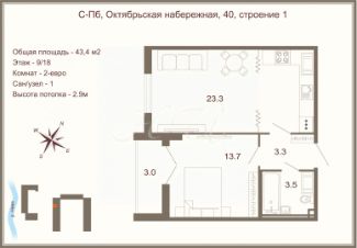 Просторная светлая квартира 43,4 м2 + лоджия 3 м2, евро-2-х комнатная.