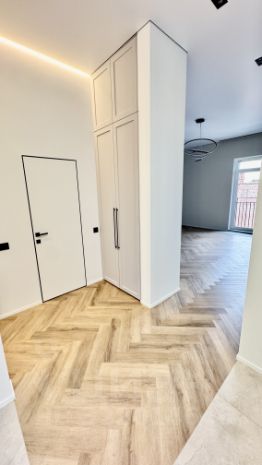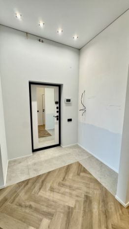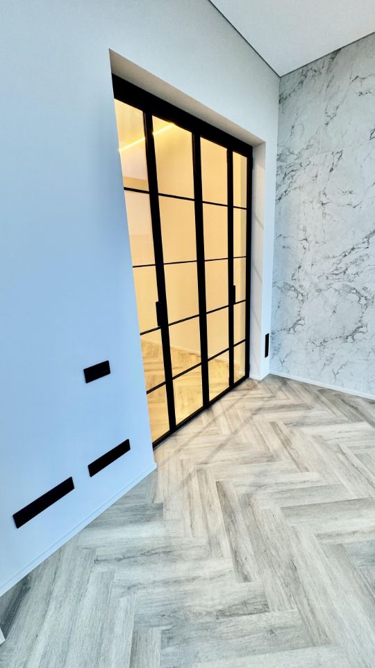 Установлена высокопрочная и шумоизоляционная входная дверь, глазок электронный с возможностью записи происходящего за входной дверью, установлен видеодомофон, проведен интернет, межкомнатные скрытые двери высочайшего качества выполнены в цвет стен с окантовкой и фурнитурой черного цвета.