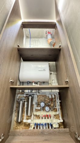 Раздельные ванна и санузел (выполнены в соответствии с дизайн проектом, установлены дополнительно бойлер + фильтры для очистки воды).