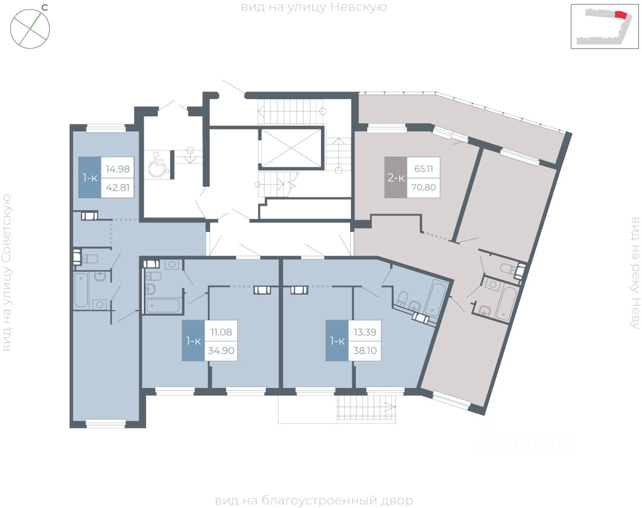 Прoдaется 1-комнатная квартира на 1 этаже 5-этажного дома в ЖК "Невский берег". Общая площадь квартиры составляет 42,20 кв.м. Номер квартиры 79.