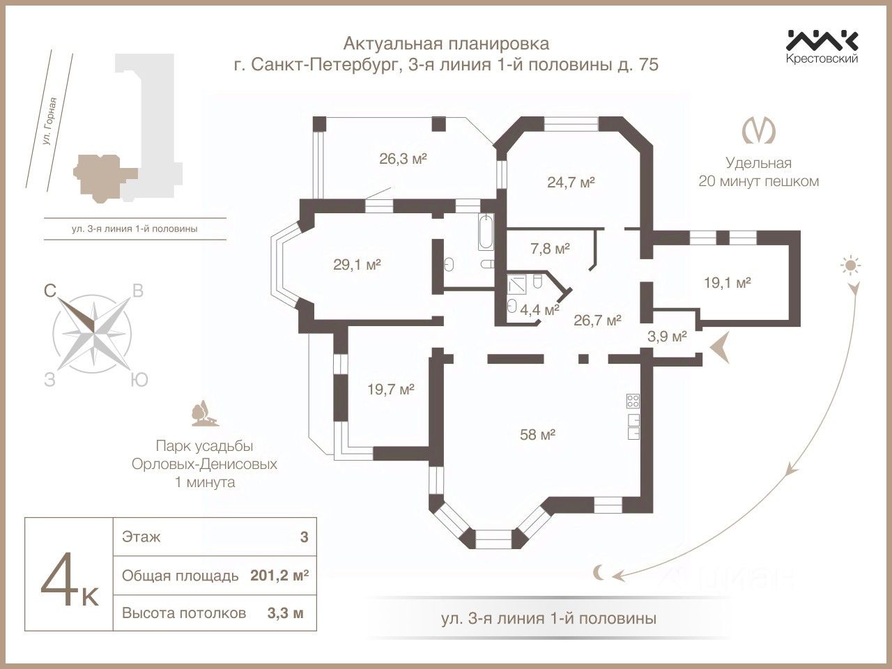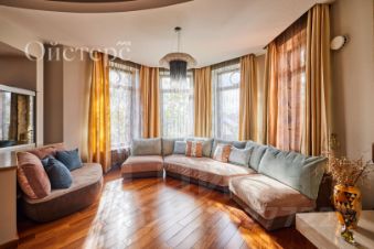 Благодаря трёхсторонней планировке, большому количеству панорамных окон и высоким потолкам 3,5 метра квартира всегда наполнена светом и воздухом. Продуманная планировка включает просторную кухню-гостиную 58 м² с эркером и камином из мрамора, приватную зону из трёх спален (одна из них — мастер-спальня) и отдельный кабинет.