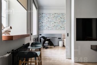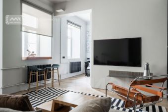 Функциональное и грамотное планировочное решение: прихожая с зоной хранения, кухня плавно перетекающая в гостиную, спальня со своим выходом в ванную комнату, душевая с "умным" туалетом. На полу: массив дуба, теплый пол в зонах кафеля. Мебель от именитых зарубежных дизайнеров: Flexform, Moooi, Tom Dixon, Knoll. Акустическая система Bang & Olufsen. Много вариантов освещения, для того чтобы регулировать уютную атмосферу;
