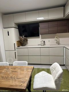 Кухня с техникой, диваном, столом и креслами .