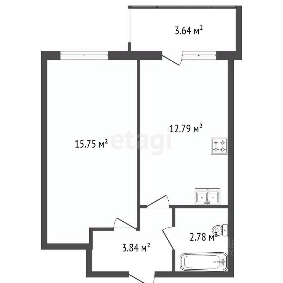 Общая площадь 35,2 м² включает комнату 15,75 м², кухню 12,79 м², совмещенный санузел и большую застекленную лоджию 3,64 м².
