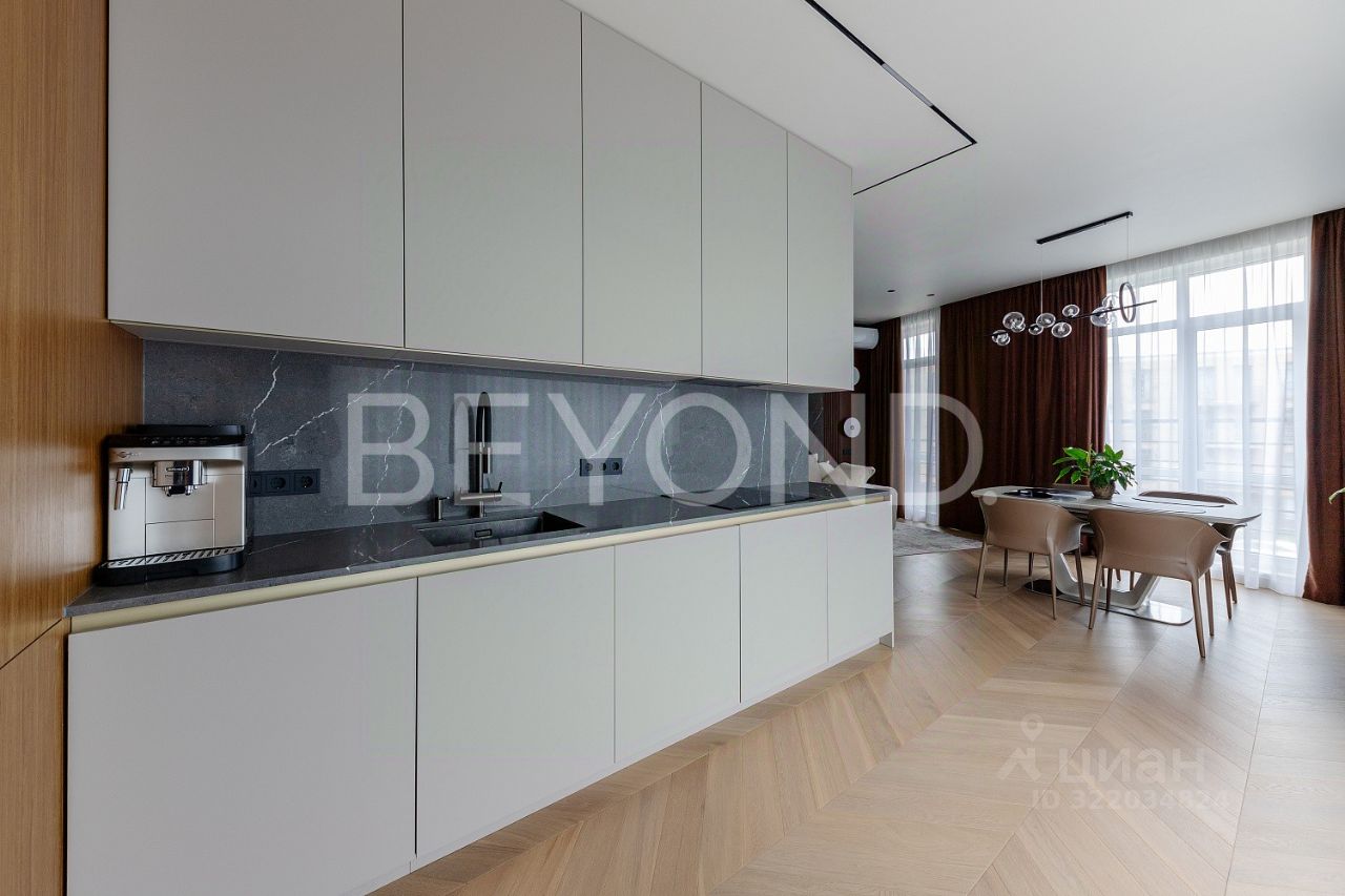 Мебель выполнена на заказ и встроена идеально. Благодаря большому количеству окон в пол дневной свет в квартире присутствует в изобилии.