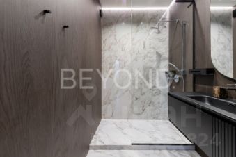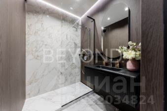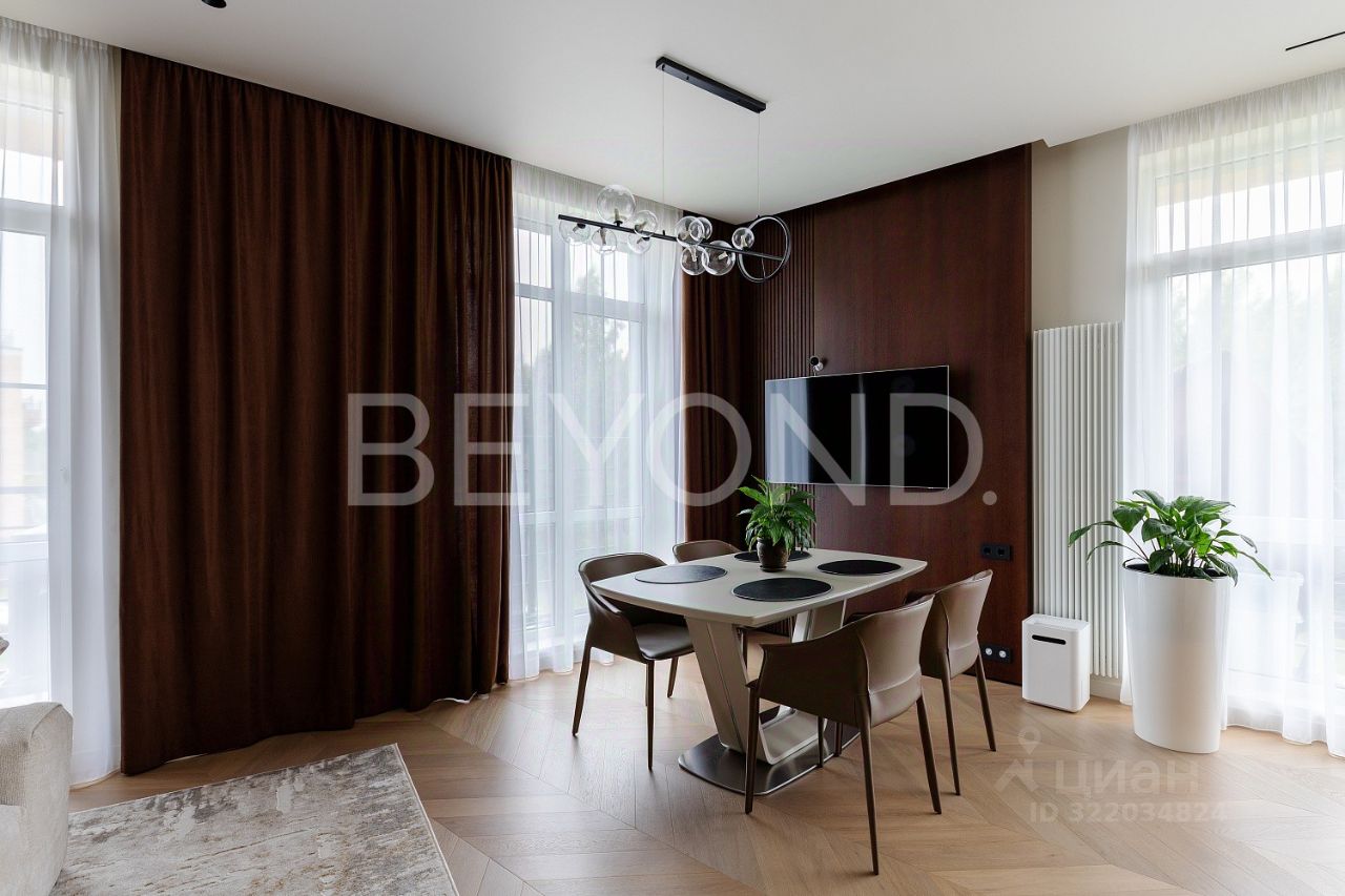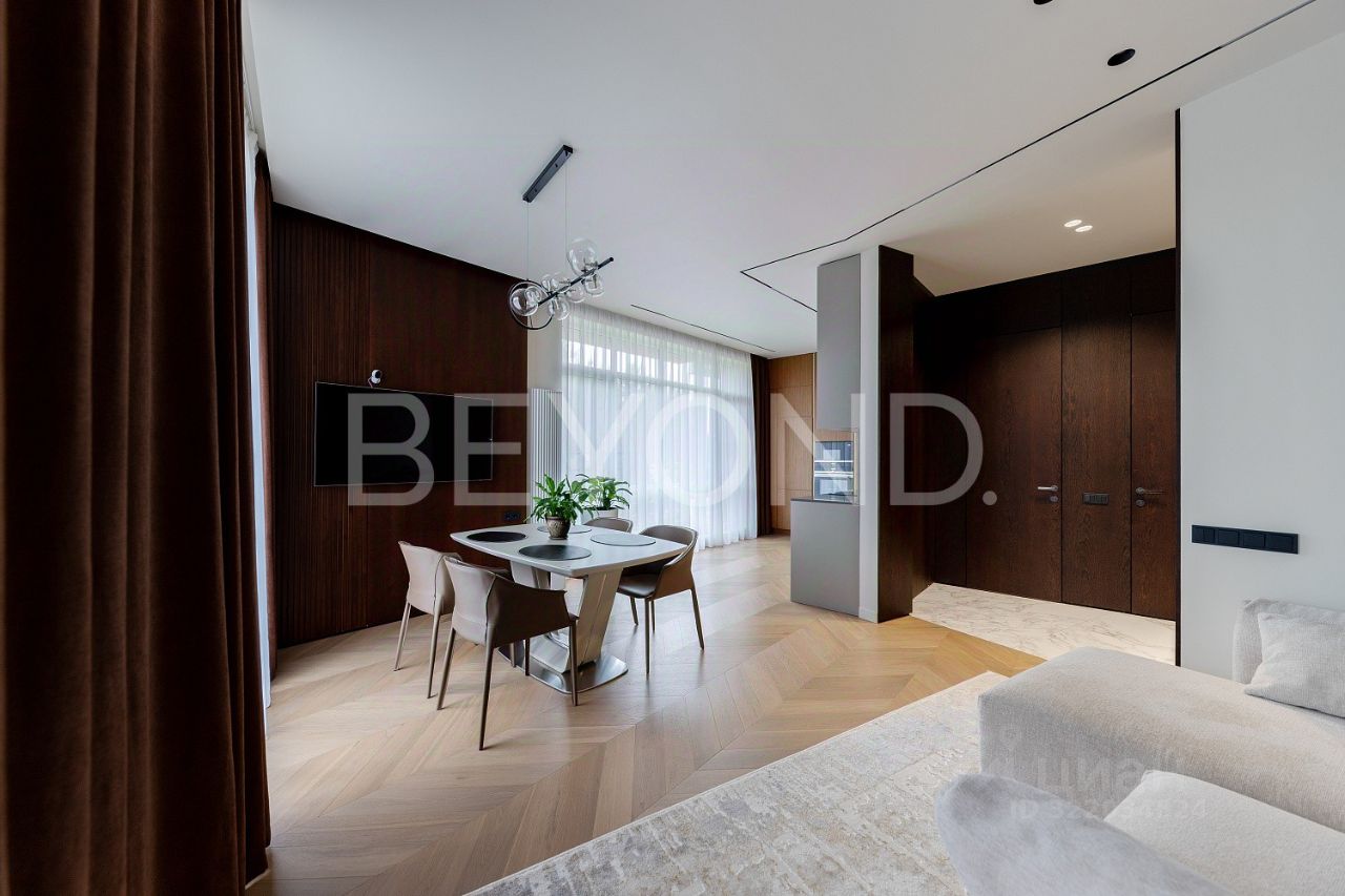 Интерьер воплощён по дизайн-проекту, основой которого является сочетание благородных оттенков и природных материалов с технологичным наполнением.