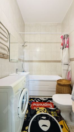 - Санузел оснащён полноценной ванной, стиральной машиной и эстетичной отделкой плиткой