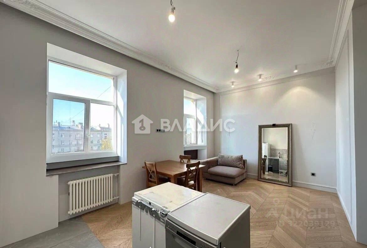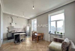 - Просторная кухня-гостиная с уютной обеденной зоной возле окна с видом на проспект Стачек.