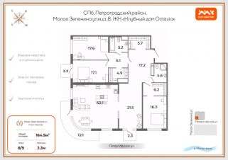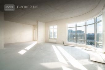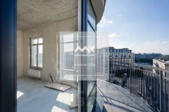 Высота потолков 3.30 м. Продуманное планировочное решение: четыре изолированные комнаты, просторная кухня-гостиная, три с/у, три гардеробные комнаты и три балкона, один из который круговой, площадью 12 метров.