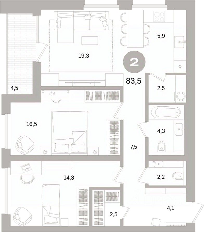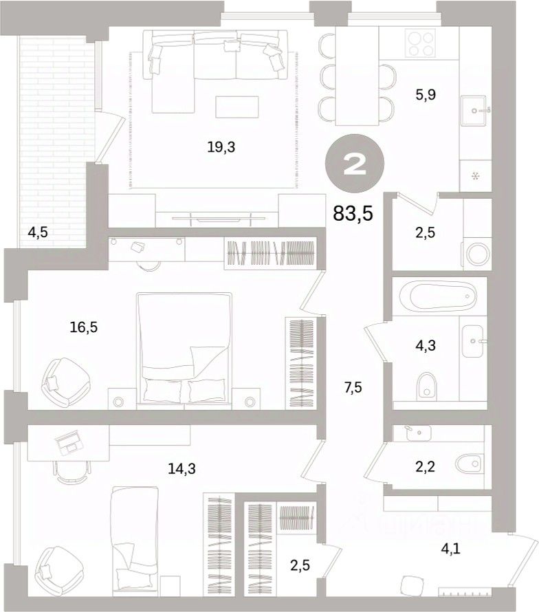Двухкомнатная квартира от застройщика с предчистовой отделкой в ЖК "Северный ветер" на 5 этаже. Общая площадь: 83.51 кв.м., жилая: 30.8 кв.м., площадь просторной кухни-столовой: 25.2 кв.м. Квартира угловая, очень светлая, естественная вентиляция при открытии окон. В квартире одна лоджия, один совмещенный и один раздельный санузел. Высота потолков 3.1 м.