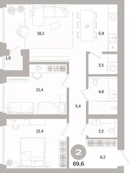 Продается 2-комн. квартира с предчистовой отделкой в ЖК "Северный ветер" на 2 этаже. Общая площадь: 69.58 кв.м., жилая: 23.8 кв.м., площадь просторной кухни-столовой: 18.1 кв.м. Комнаты изолированные, все окна выходят на одну сторону. В квартире одна лоджия, один совмещенный и один раздельный санузел. Высота потолков 3.1 м.