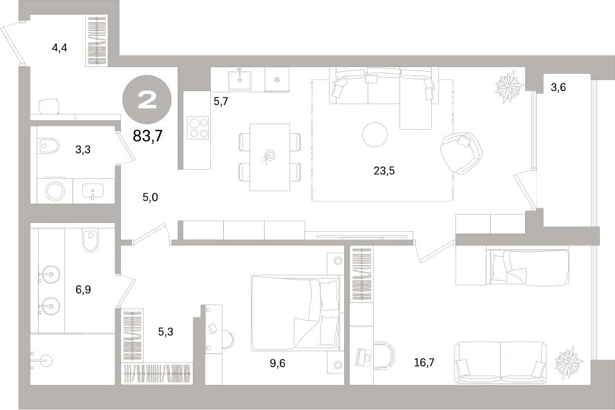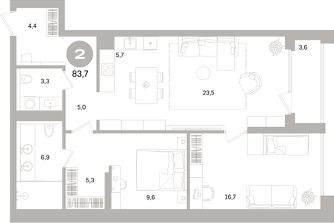 Просторная 2-комн. квартира с предчистовой отделкой в ЖК "Северный ветер" на 2 этаже. Общая площадь: 83.74 кв.м., жилая: 26.3 кв.м., площадь просторной кухни-столовой: 23.5 кв.м. Комнаты изолированные, все окна выходят на одну сторону. В квартире одна лоджия, один совмещенный и один раздельный санузел. Высота потолков 3.1 м.
