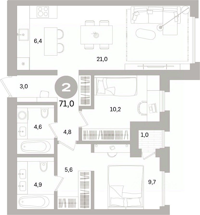 2-комн. квартира с предчистовой отделкой в ЖК "Северный ветер" на 5 этаже. Общая площадь: 70.99 кв.м., жилая: 19.9 кв.м., площадь просторной кухни-столовой: 21 кв.м. Комнаты изолированные, все окна выходят на одну сторону. В квартире одна лоджия, два совмещенных санузла. Высота потолков 3.1 м.