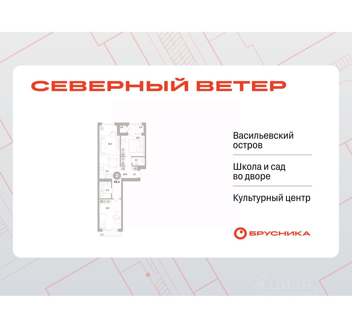 2-комн. квартира от застройщика с предчистовой отделкой в ЖК "Северный ветер" на 2 этаже. Общая площадь: 69.36 кв.м., жилая: 24.4 кв.м., площадь просторной кухни-столовой: 15.3 кв.м. Квартира - распашонка, без проходных комнат, окна выходят на paзные стороны дома. В квартире одна лоджия, один совмещенный и один раздельный санузел. Высота потолков 3.1 м.