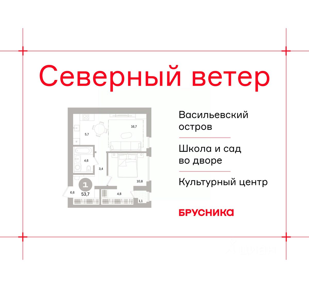 1-комн. квартира с предчистовой отделкой в ЖК "Северный ветер" на 3 этаже. Общая площадь: 53.66 кв.м., жилая: 10.8 кв.м., площадь просторной кухни-столовой: 16.7 кв.м. Все окна выходят на одну сторону. В квартире одна лоджия, один совмещенный санузел. Высота потолков 3.1 м.