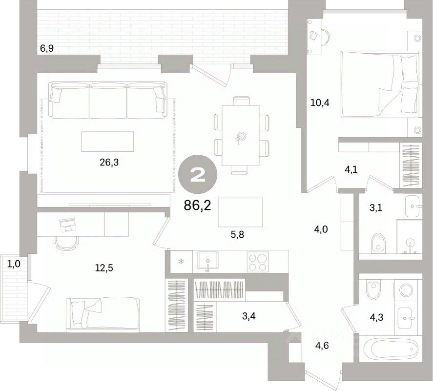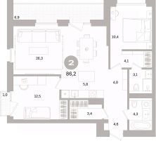 Двухкомнатная квартира с предчистовой отделкой в ЖК "Северный ветер" на 7 этаже. Общая площадь: 86.24 кв.м., жилая: 22.9 кв.м., площадь просторной кухни-столовой: 32.1 кв.м. Квартира угловая, окна oбecпeчивaют paвнoмepнoe ocвeщeниe в тeчeниe дня. В квартире один балкон и одна лоджия, два совмещенных санузла. Высота потолков 3.1 м.
