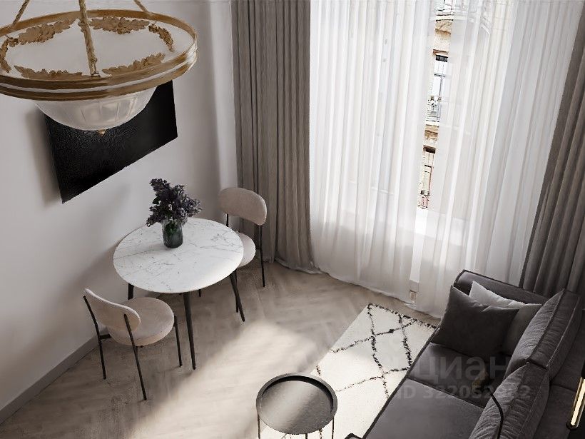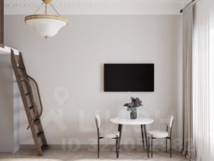 На фото студии представлен дизайн-проект, по которому выполняется отделка студии - преобладание классической стилистики, декоративных молдингов и высоких напольных плинтусов. Ремонт проводится только с использованием качественным материалов. Новый ламинат елочкой или восстановленная паркетная доска в ряде студий - сохранение внешнего облика с применением современных технологий - идеальный баланс классики и современного стиля!