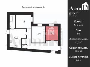 Площадь квартиры: 69 кв.м. (3 жилые комнаты)