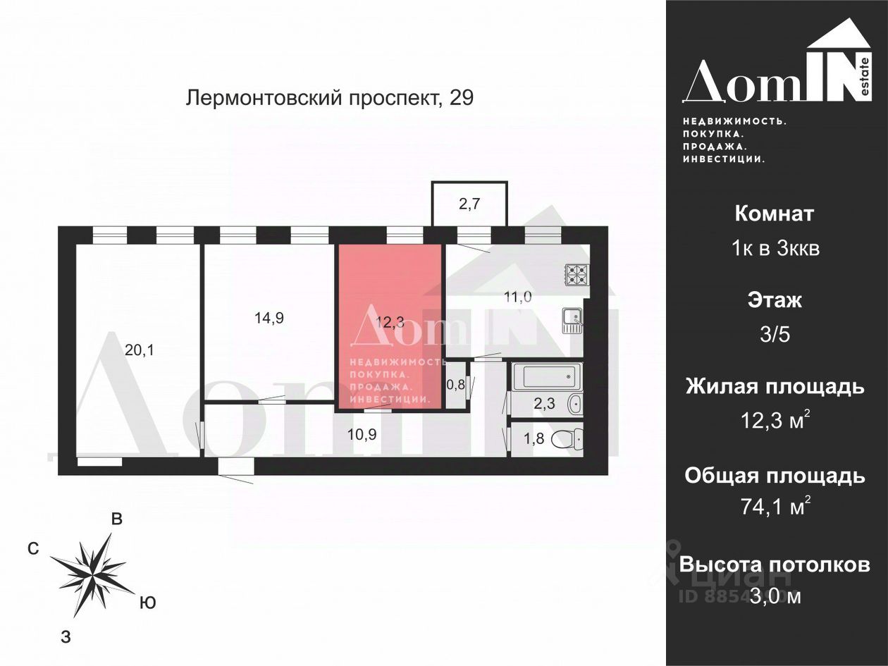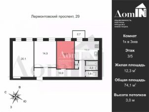 Площадь квартиры: 74.1 кв.м. (3 жилые комнаты)