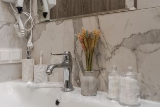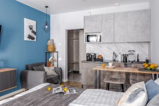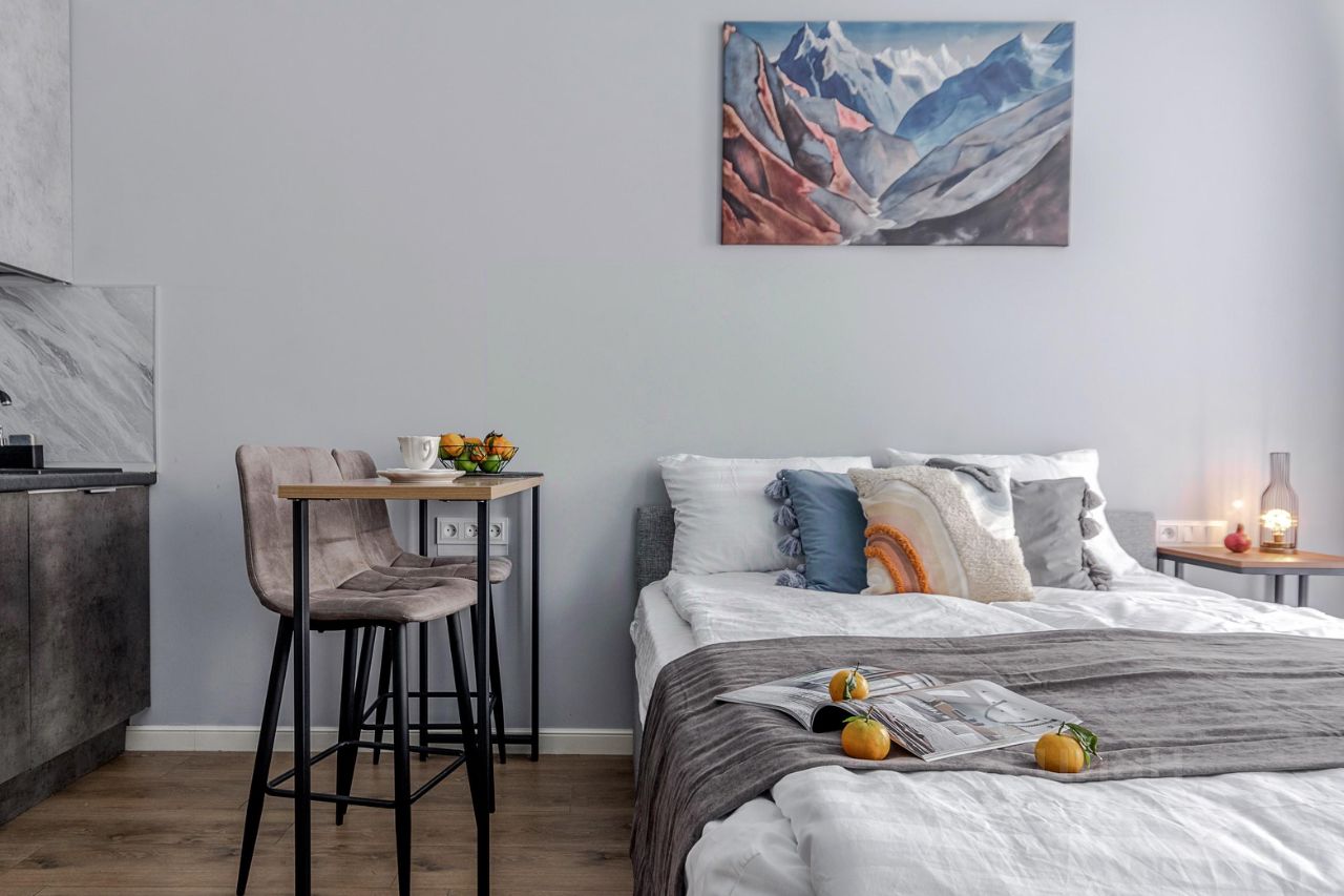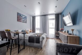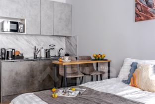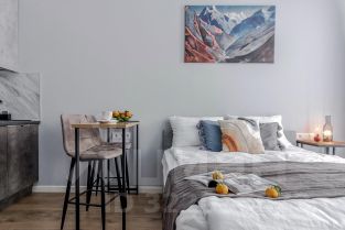 Студия на первом этаже с открытым балконом и с личным выходом на улицу. Общая площадь 24,5 кв м, плюс балкон 2,5 кв м. Кухня оборудована встроенной посудомоечной машиной и холодильником.