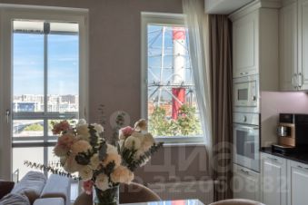 Двухсторонняя квартира площадью 82,5 кв.м. с просторной функциональной кухней-гостиной площадью 35 кв.м. с выходом на широкий балкон площадью 7,3 кв.м. с которого открывается очень яркий и впечатляющий вид на реку, город, телебашню.