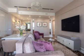 Ремонт выполнен в точности по дизайн проекту. Имеется вся техническая документация. Квартира очень уютная, красивая и стильная, оборудована встроенной , корпусной и мягкой мебелью на заказ , всей необходимой бытовой техникой и сантехникой люксовых европейских брендов, оснащена дизайнерскими элементами декора и текстиля.