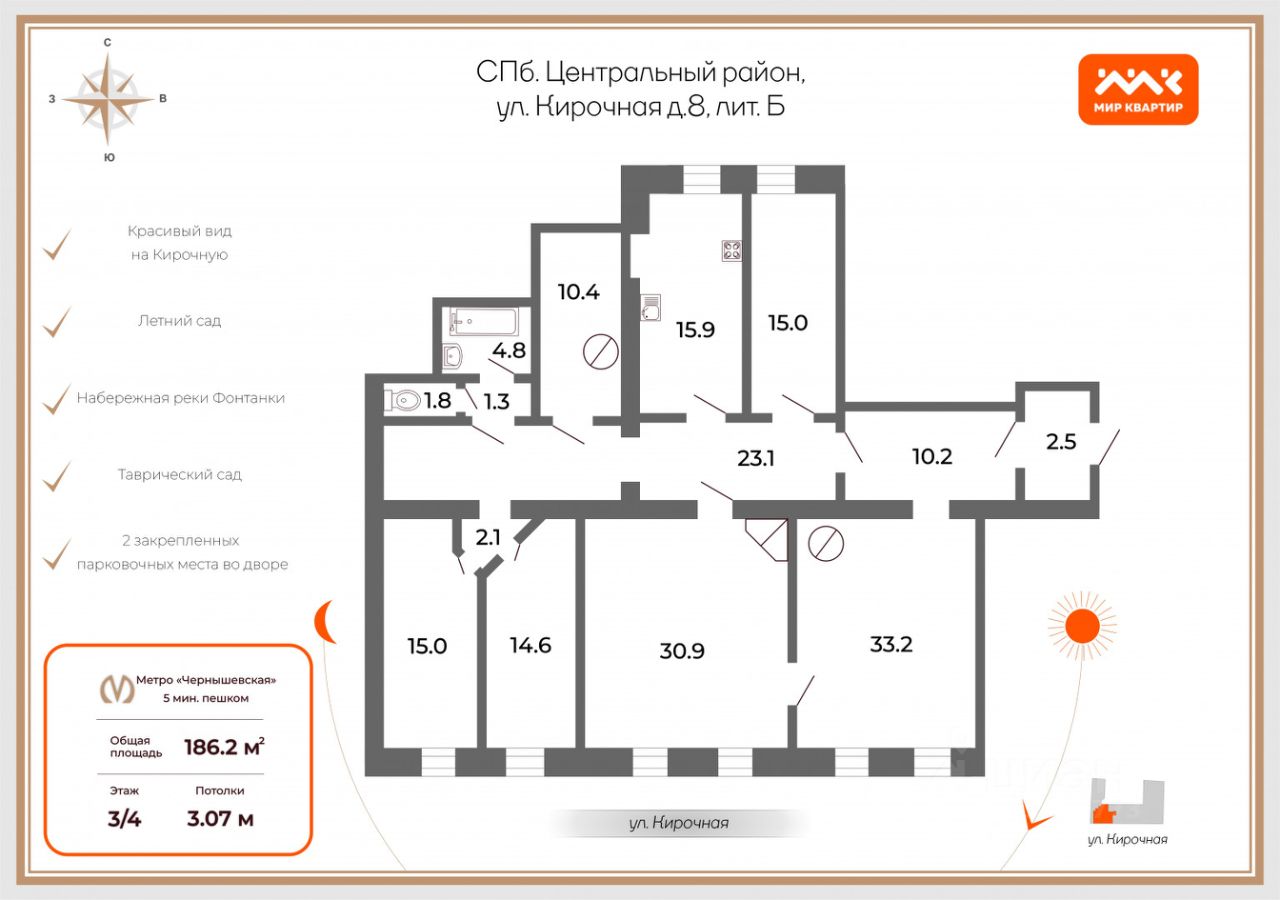 Железобетонные перекрытия! Большая чистая парадная, вход с улицы Кирочная. Просторный внутренний двор с достаточным количеством парковочных мест, есть два закрепленных, ворота закрываются.